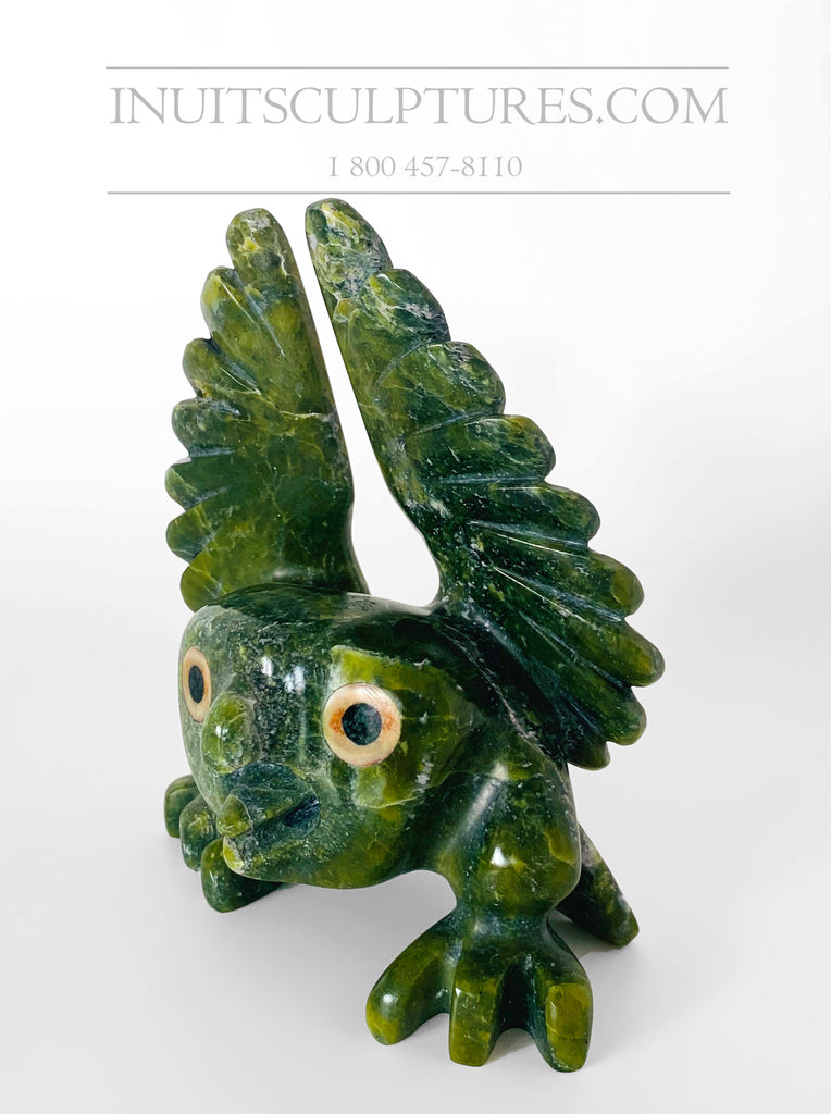"Toonoo's parents, Josephee Sharky and Ragee Killiktee, were both carvers, though he credits his grandfather, master carver Kuppapik Ragee and his uncle Shorty Killiktee as influences. Toonoo started carving at ten, began to get serious at thirteen and first exhibited when he was just 17. He is regarded as one of the most exciting young carvers to emerge in the Arctic. His themes include fanciful and quite dramatic treatment of wildlife, particularly birds, and transformational works that are both powerful and humorous. His work is widely shown, and he was elected to the Royal Canadian Academy in 2003." *