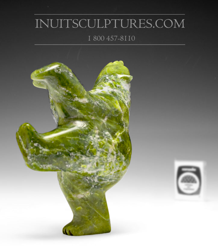 This bear was obviously carved by an artist who carefully observed the animal subjects and Loved them. Despite being carved from a large sized, heavy stone, the work has a lightness of spirit. The apple green stone is divine and electric.