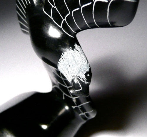 This is a beautiful eagle by Josie Ohaytook. It is made with a beautiful dark argillite stone. The wings are fully spread with striking etchings of the feathers. This detail gives depth and excitement to the carving as the white head and feathers contrast beautifully against the dark stone.
