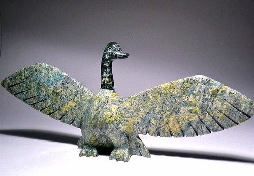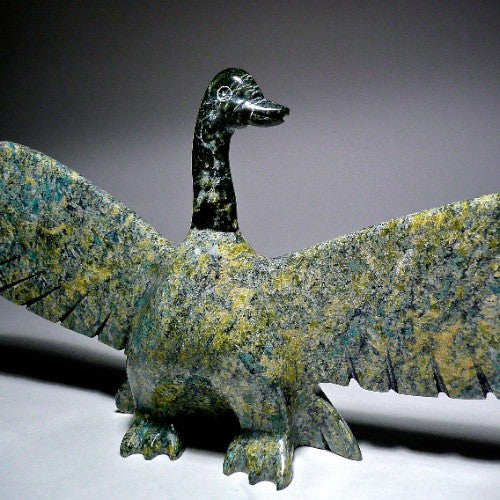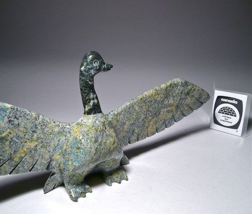 This is a beautiful bird from Cape Dorset directly from Johnysa Mathewsie. What is so special about this carving is that there are two different colors in the stone. From the neck up, the stone color is a beautiful darkened serpentine stone. On the wings and torseau, the color is a beautiful traditional green. The two colors merging together really make this wonderful bird carving stand out.