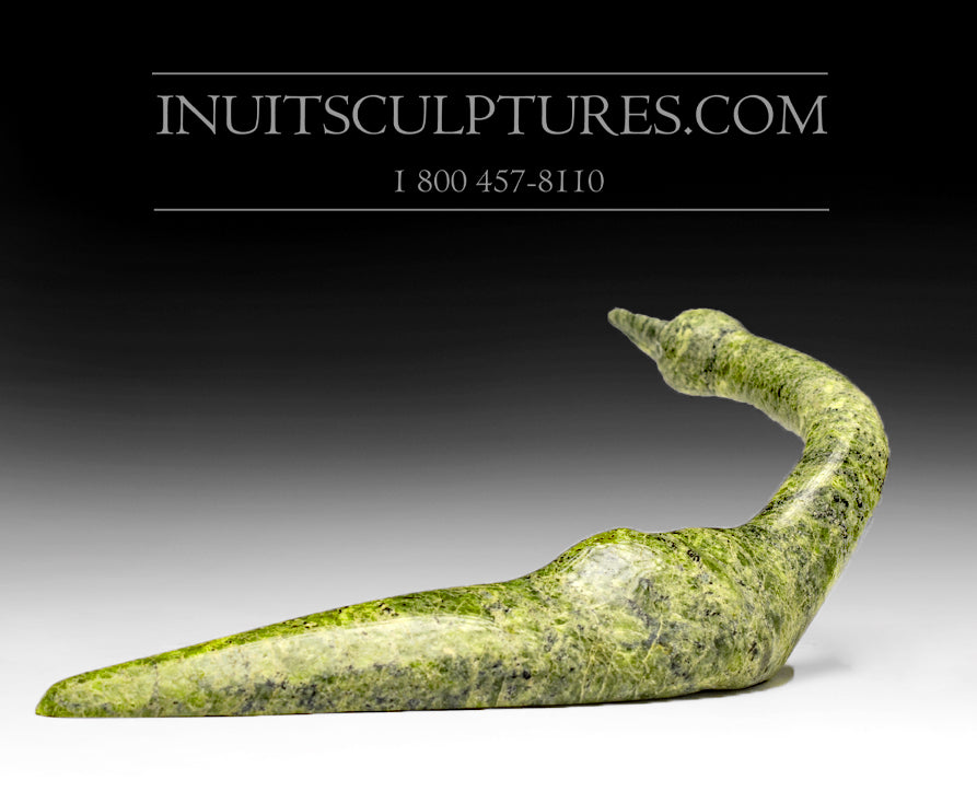 This is a fantastic swan by Cape Dorset artist, Ning Ashoona. This piece would give a calm aura and atmosphere to any space it is presented in. Its movements and colours are extremely unique and incredible. This carving would undoubtedly make a great gift.