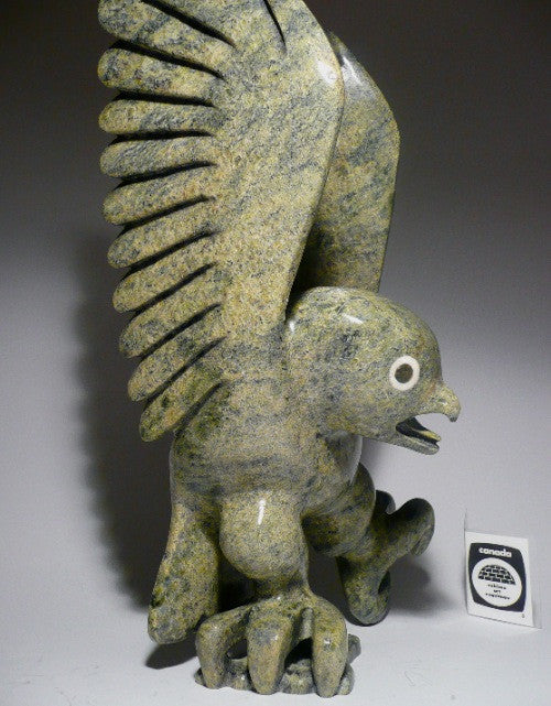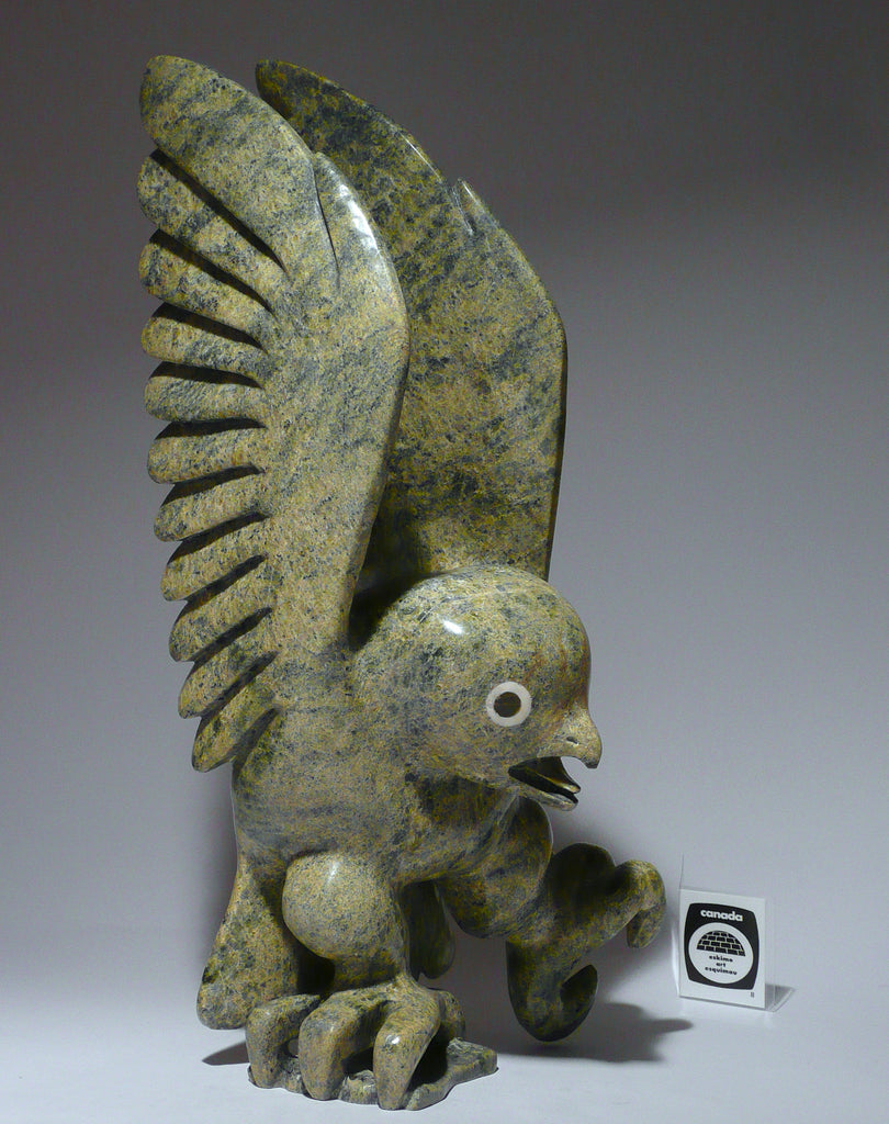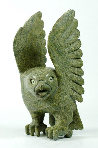 This is an outstanding owl by famous Toonoo Sharky from Cape Dorset. This beautiful owl is new. This Inuit art masterpiece is BIG, it measures 14" tall, 8.5" wide. It is made out of serpentine.