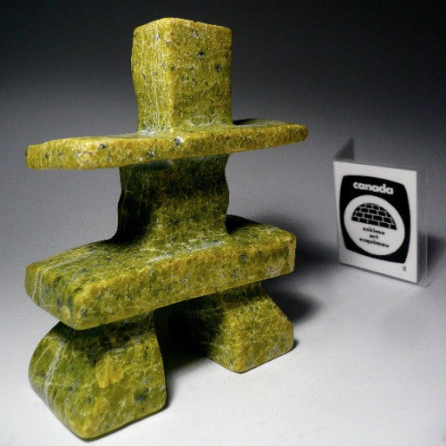 This is a gorgeous light green Inukshuk by Adam Lyta. Specifically with this Inukshuk, the finish is smooth and polished. I really like the light green Adam uses in this context. It illuminates the carving and makes it very noticeable.