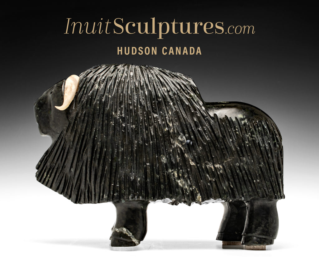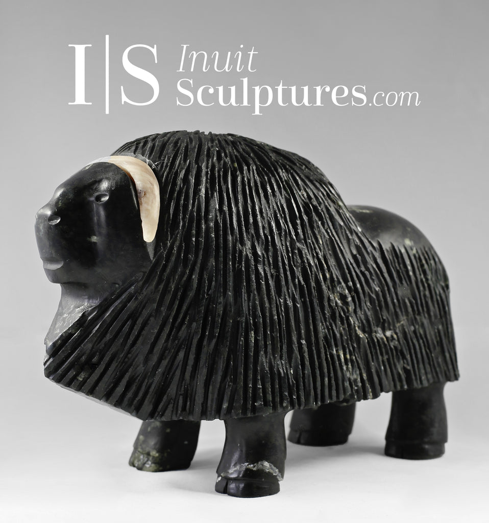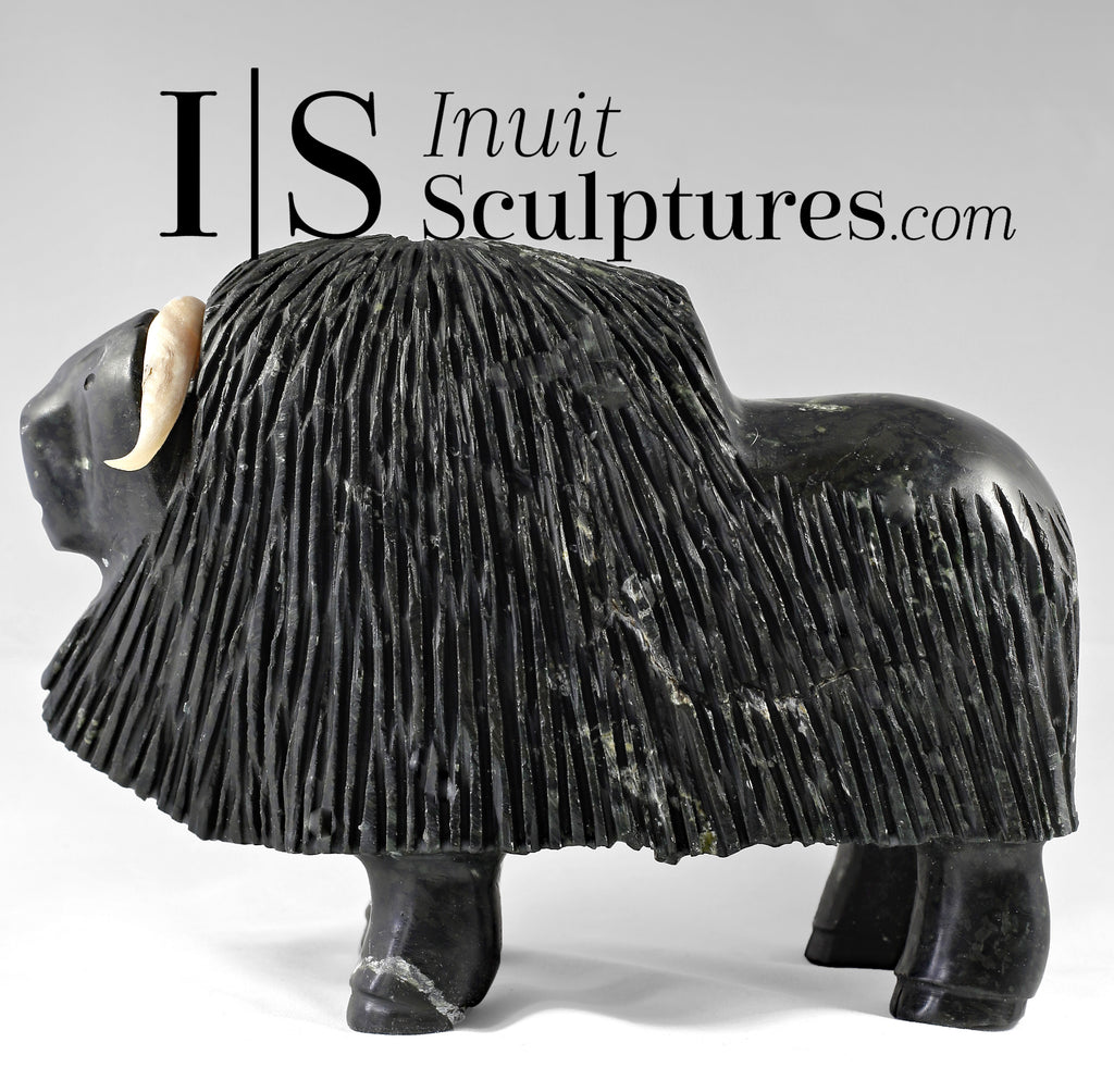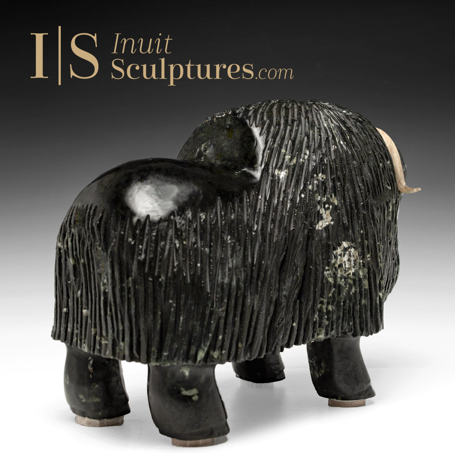 In this intriguing and ambitious work, Uttaq presents us with a carving that exhibits all the traditional features of a classic Muskox; the exaggerated "humped" shoulders, the regal horns and the dense long coat of hair.