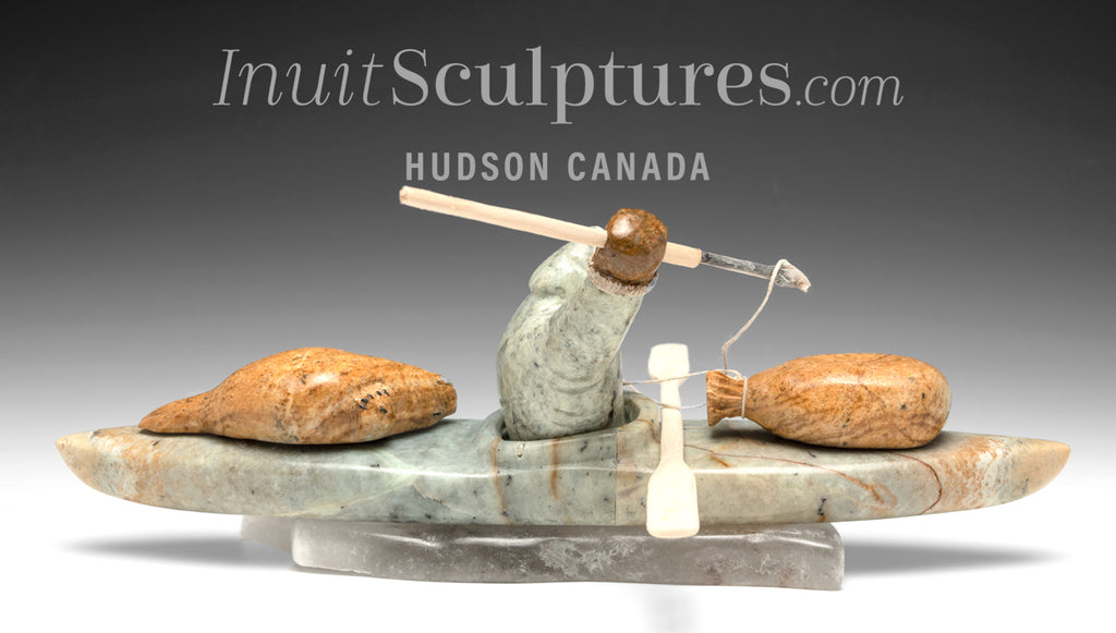 Peter has carved a scene of an Inuk in his kayak (umiak) fervently paddling home with his kill!