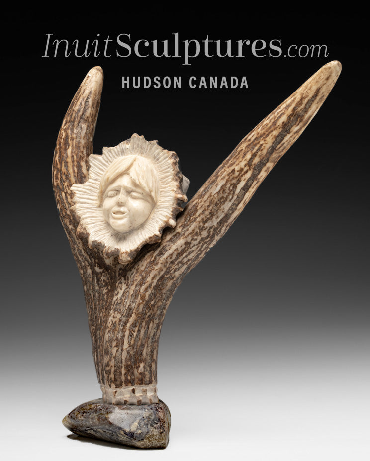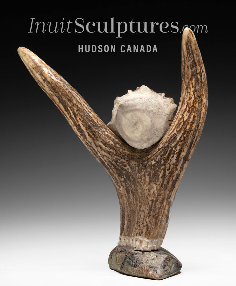 Dale has placed the head in the notch of caribou antlers which form the body of the Inuk.