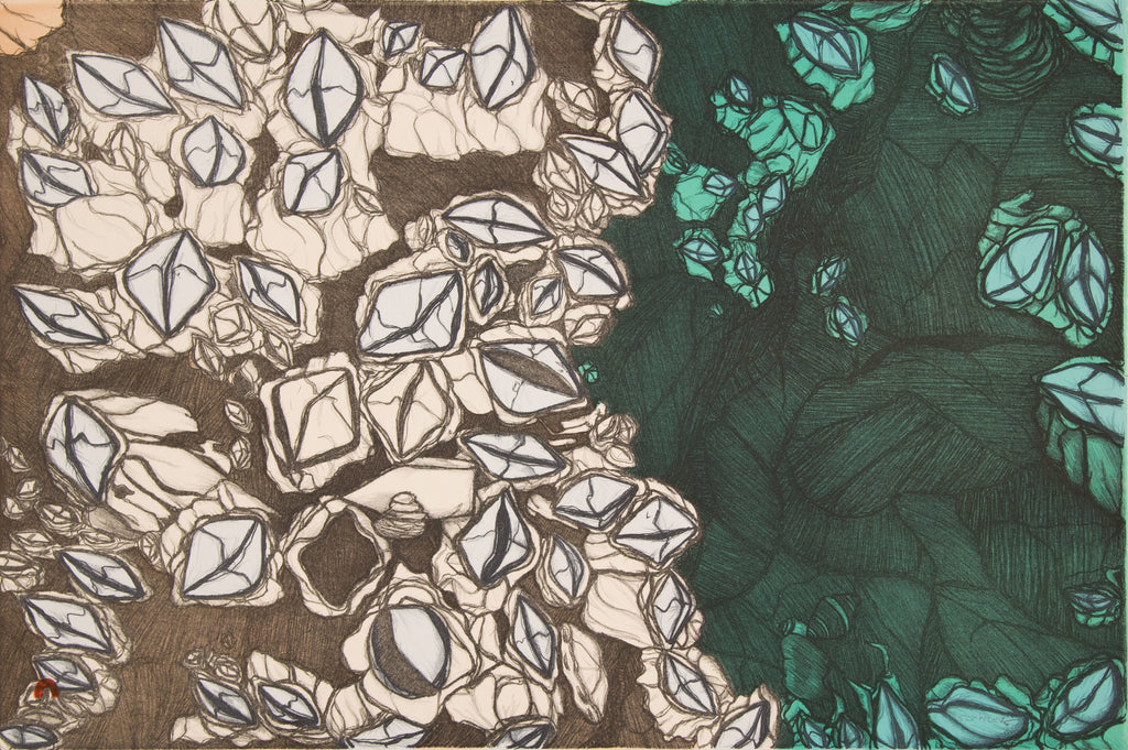 PADLOO SAMAYUALIEBarnaclesLithographPaper: BFK Rives CreamPrinter: Niveaksie Quvianaqtuliaq38 x 56.5 cmReleased in the 2018 Cape Dorset Print collection