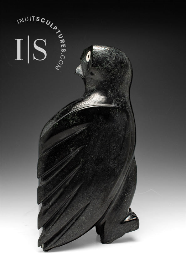The majority of Inuit Owl carvings have large sturdy feet, large inlaid eyes, are geometric in their style, and have a prominent beak.