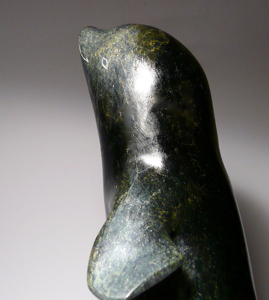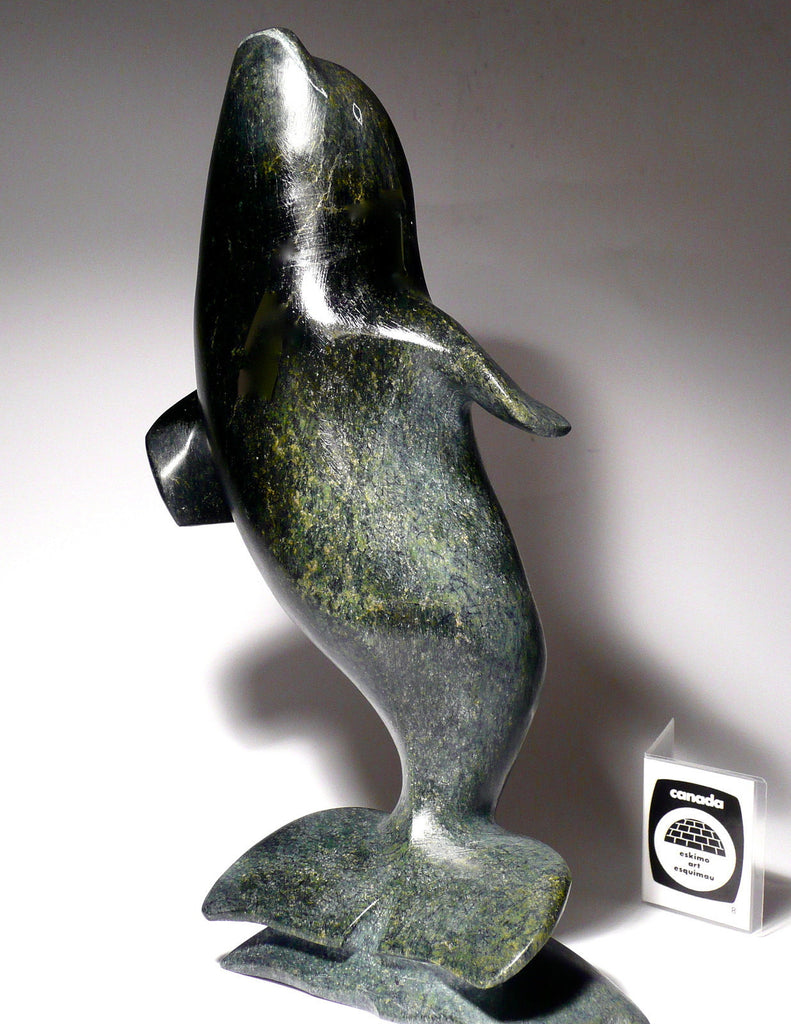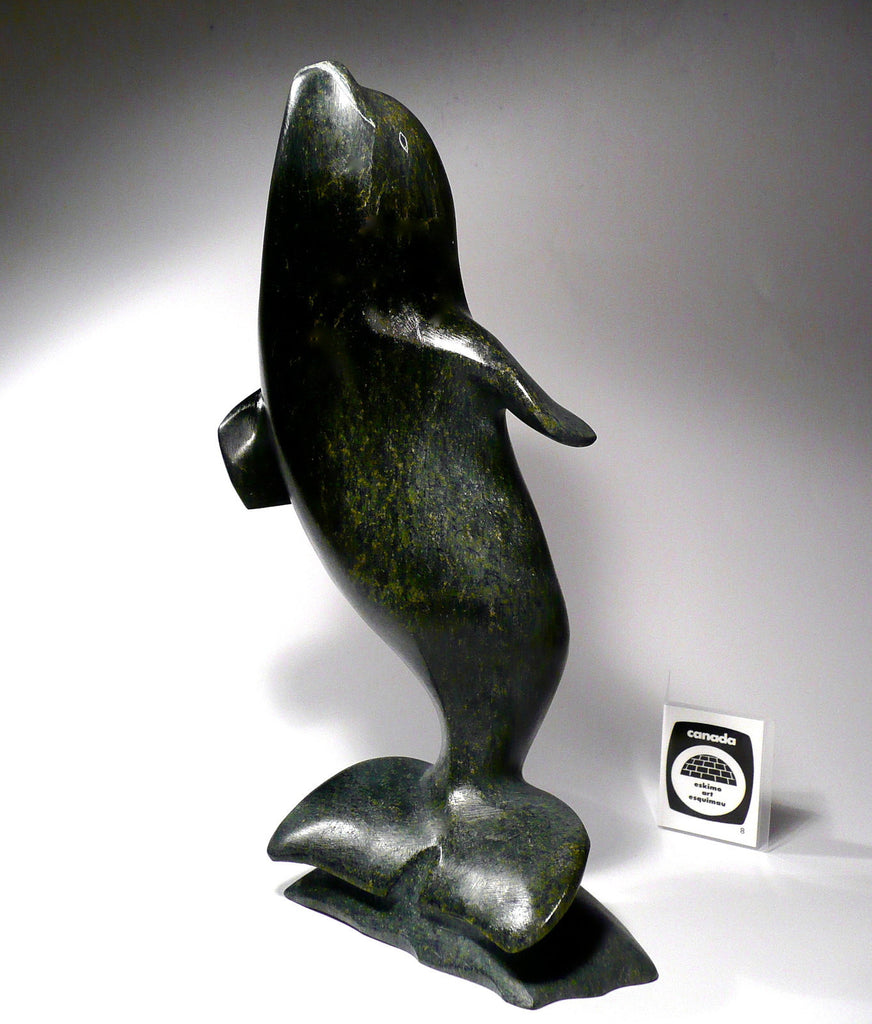 This is an exceptional dancing whale made by Inuit artist A. Tikivik from Pangnirtung, Nunavut. The dark stone allow for a beautiful contrast from its background making this beautiful whale really stand out.