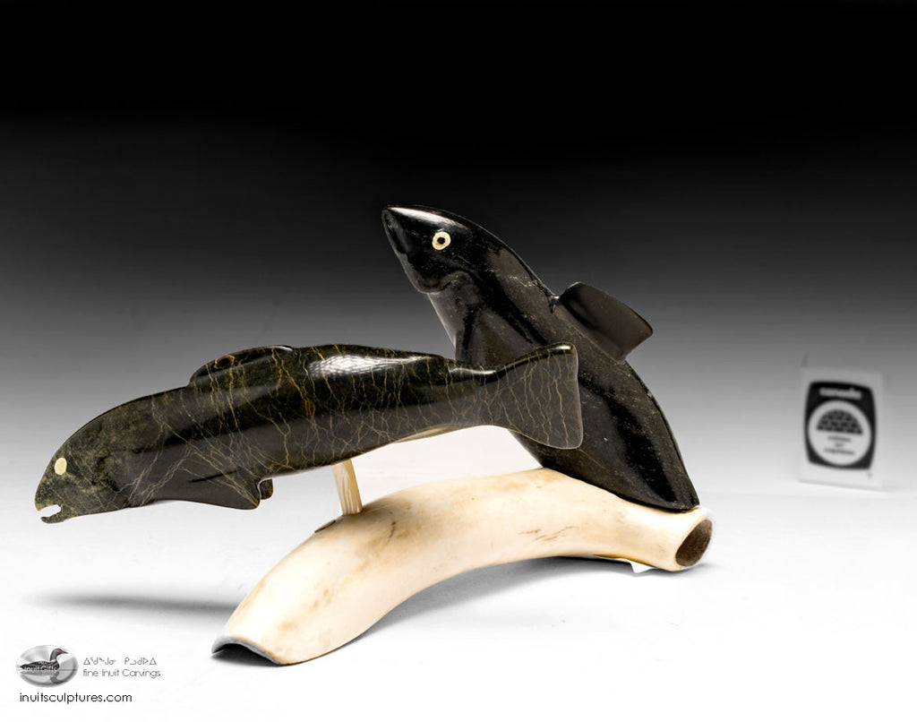 This piece depicts two beautiful arctic char fish with inlaid eyes swimming in an ocean.