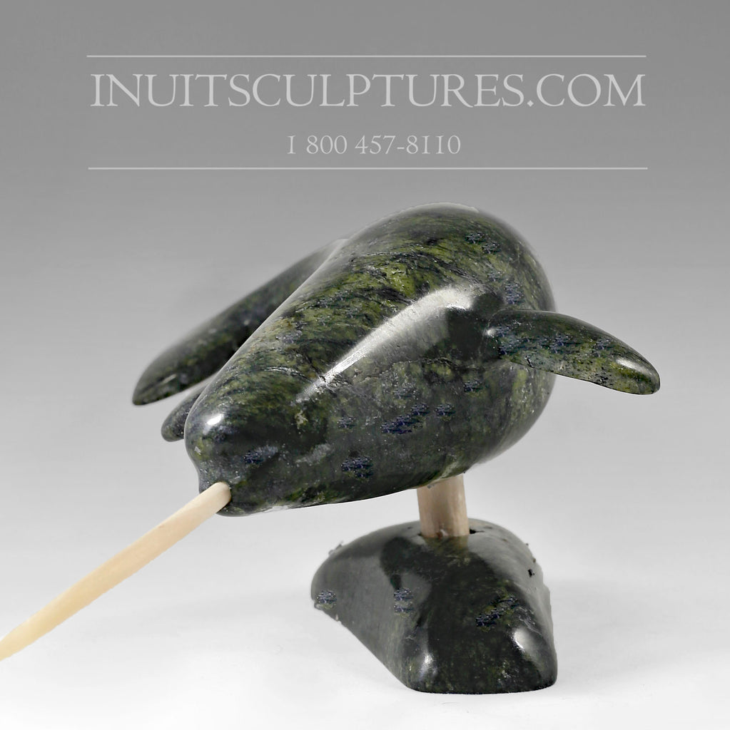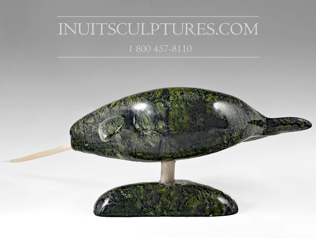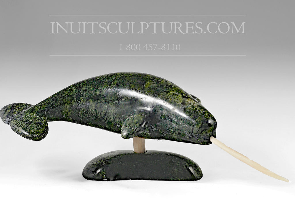 This is a beautiful rendition of a swimming Narwhal by Louis Uttaq. Powerful creatures of the Arctic sea, this piece is elevated on an antler allowing the viewer to observe his power and might as it speeds through the water like lightening.