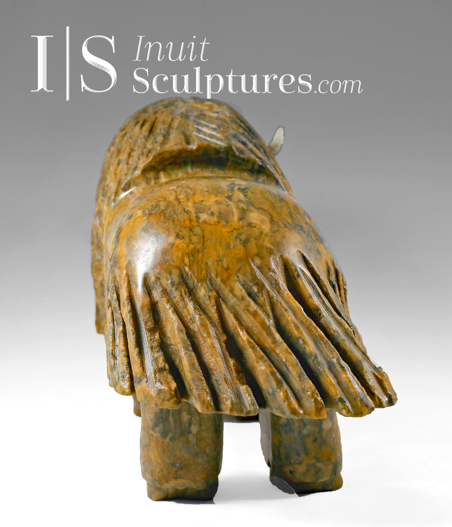 This pensive Louie Uttaq Muskox is carved using Mudstone*. Although the camera lights gives the stone a mustard gold look, the actual colour is more of a warm medium tan.