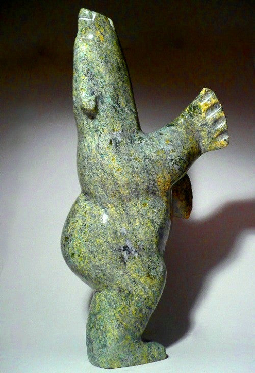 Joanie Ragee is a very well established artist and is recognized internationally for his dancing bears. His dancing bears are full of life with much movement. This is what attracts Inuit art enthusiasts to his works. Joanie Ragee prefers to carve using stone with the traditional green coloration. He expresses himself mostly by allowing his dancing bears to balance perfectly while dancing on one or both legs.
