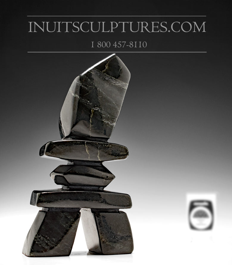 This is a gorgeous balanced Inukshuk done in a striking deep black stone. The curves are exceptional The dark black stone adds a beautiful clash between modernism and traditional style. Polished to a mirror shine.