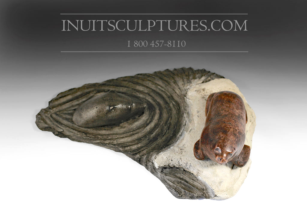 The craftsmanship of this bear and seal are absolutely divine. As a curator of the gallery, I am particularly drawn to carvings that are made from mixed media. This one in particular is made from two different stones that contrast splendidly together.