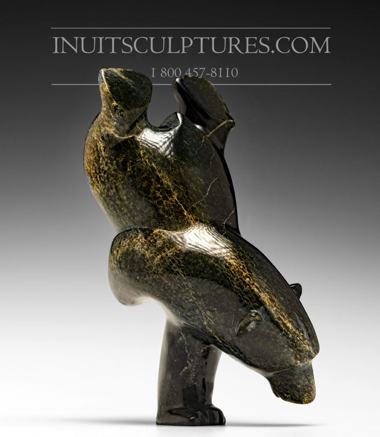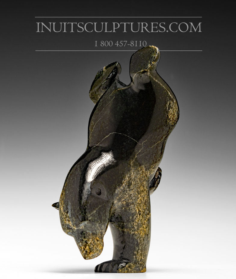 This is a gorgeous dancing bear done in an exquisite brown serpentine stone from Cape Dorset. It is this colored stone of unequivocal beauty that creates this mesmerizing ballet of colour. The motion and posture of the bear is dynamic and vibrant. The finesse and smooth contours in the stone make this a world class piece.