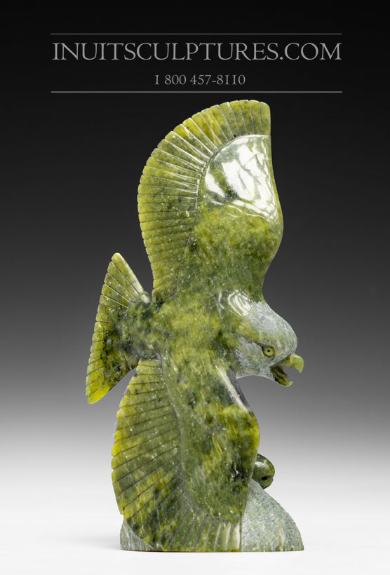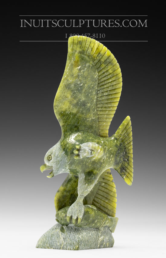 This sculpture is an extremely rare eagle with fish presented by Canada’s most recognized Inuit artist, Pitseolak (Pits) Qimirpik from Kimmirut. Pits is among three elite Inuit artists in Canada who have won international status. His carvings are found in Canada’s national art collection in Ottawa and in exhibitions around the world.