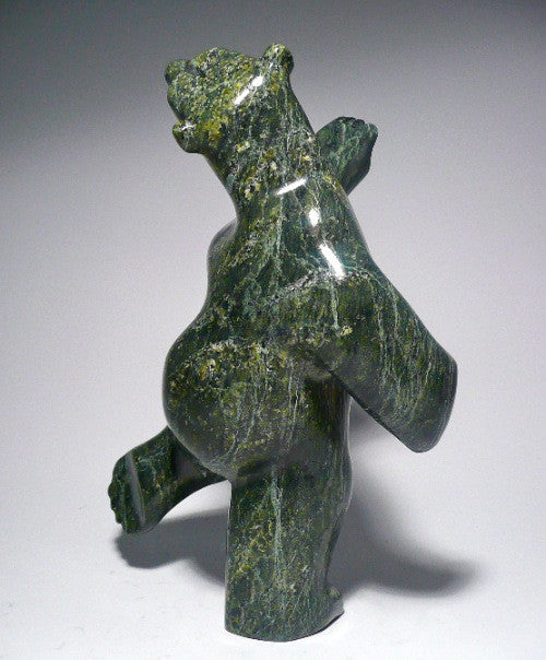 Johnny Nuveya is one of the best Inuit artists for dancing bears. His bears are very alive with full of movement and grace. This is why his bears get much praise. This bear in particular is made from a gorgeous dark green stone. It has beautiful waves against the stone which gives it a dramatic finish. This bear certainly has grace and eloquence. The lines and contours are very precise. The stone has been polished to a mirror shine. This is one of my favorite dancing bears in our collection.