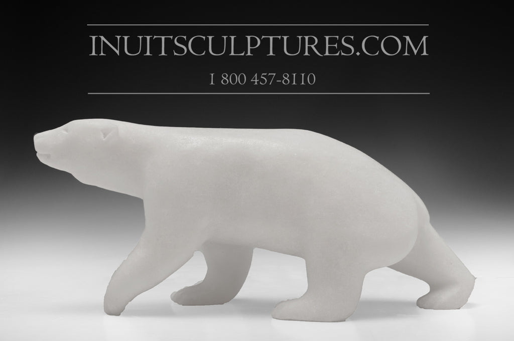 This is a gorgeous bear set in an exquisitely unique Alabaster stone. The chic charcoal white finish gives this piece a luminescent feel to its overall composition. For the avid inuit art collector, the uniqueness of the stone will really set this piece apart from your collection.