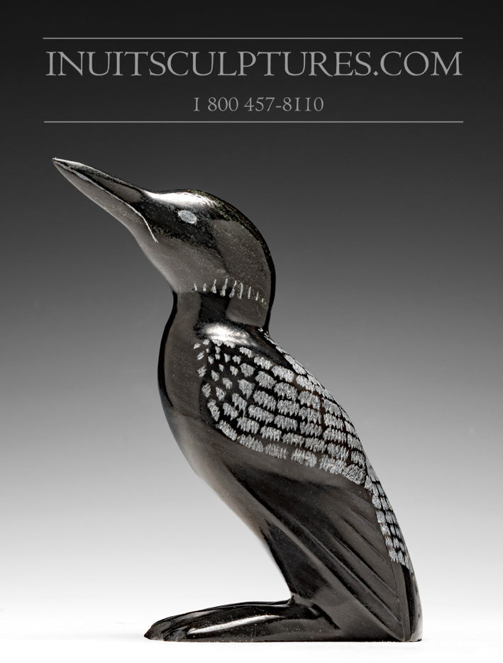 This loon is an exquisite beauty with its embroidered feathers and its atomic proportions. The avant garde circles of Inuit art adore Etidlodie’s loons. They celebrate his talent by sponsoring his solo works and publishing his sculptures in the international Inuit art journals.