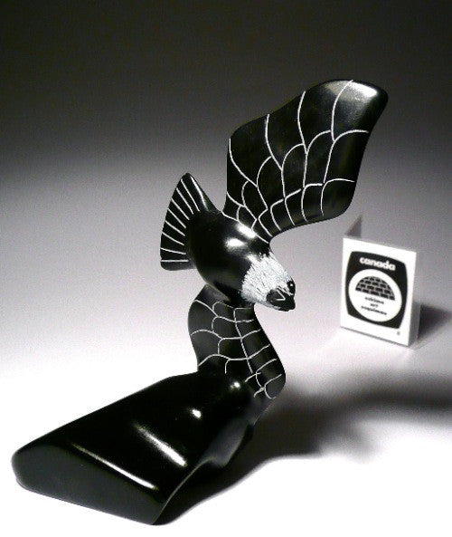 This is a beautiful eagle by Josie Ohaytook. It is made with a beautiful dark argillite stone. The wings are fully spread with striking etchings of the feathers. This detail gives depth and excitement to the carving as the white head and feathers contrast beautifully against the dark stone.