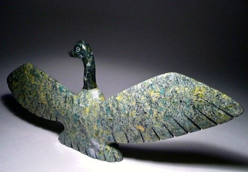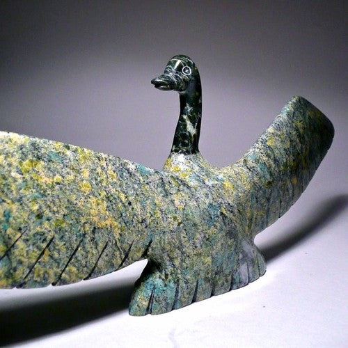 This is a beautiful bird from Cape Dorset directly from Johnysa Mathewsie. What is so special about this carving is that there are two different colors in the stone. From the neck up, the stone color is a beautiful darkened serpentine stone. On the wings and torseau, the color is a beautiful traditional green. The two colors merging together really make this wonderful bird carving stand out.