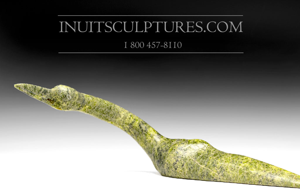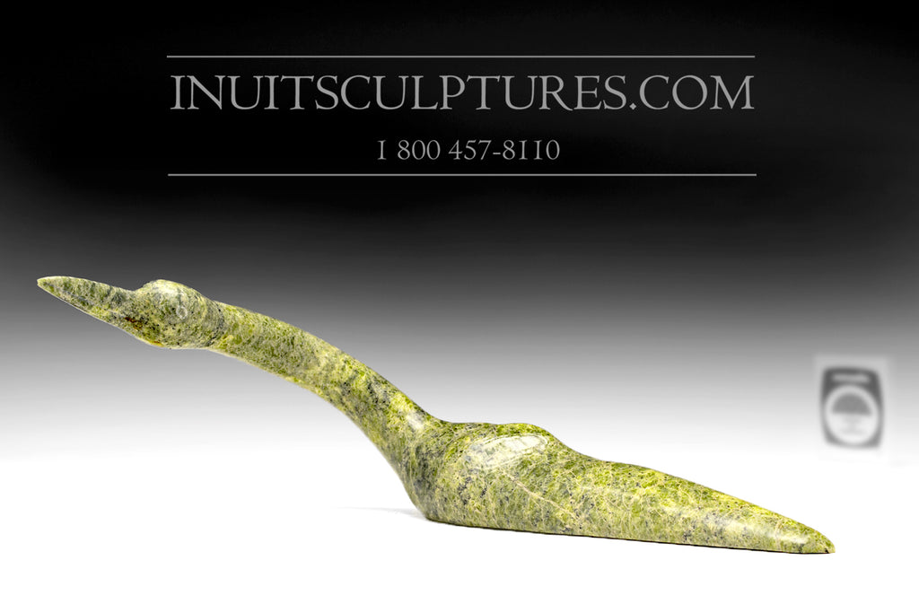 This is a fantastic swan by Cape Dorset artist, Ning Ashoona. This piece would give a calm aura and atmosphere to any space it is presented in. Its movements and colours are extremely unique and incredible. This carving would undoubtedly make a great gift.