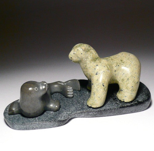 This is an exquisite piece by Inuit artist Peter Kilabuk. The transition of lime green and dark green stone between the bear and the seal make this carving come alive. Its two figures contrast wonderfully together and really make this composition stand out.
