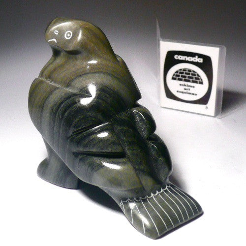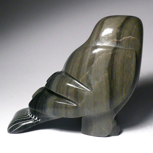 What I like about this owl is the signature Sanikiluaq argillite stone it is made from. The beautiful wavy stripes riding against the green stone give an added depth to the piece, This owl is done with a beautiful dark green, high intensity smooth finish.