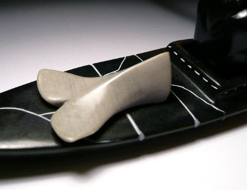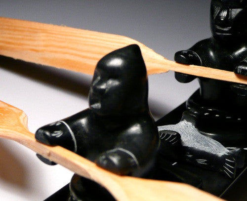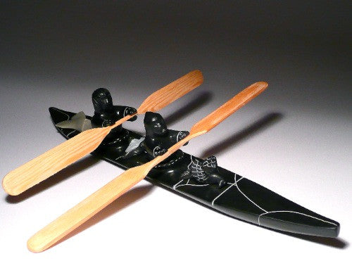 This beautiful Kayak measures 11"  long, 2.5" high, and 8.5" wide (paddles included).  The kayak is made from two different materials which blend very nicely together. The carving is from black argillite stone. The paddles are made from wood. Having this combination really makes the carving stand out. There is also beautiful detail in the Inuit faces. You will also notice three animals which were hunted. The goose and seal are very nicely detailed and add depth to the piece.