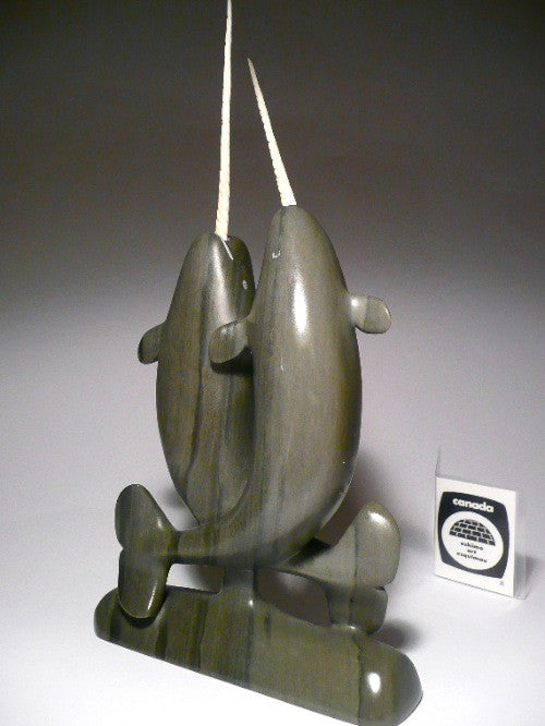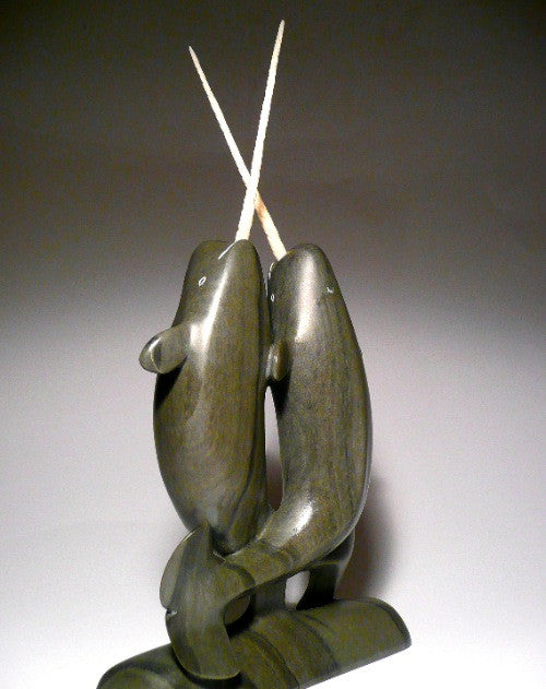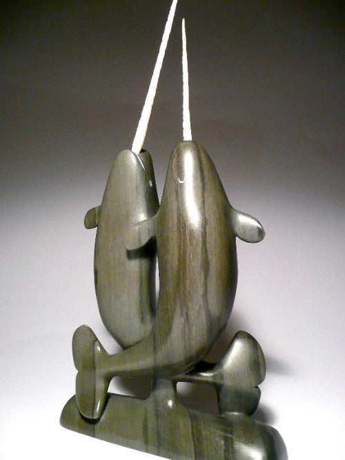 What  I like about these two narwhals is they are a double composition. I like how there tusks are entwined. The stone is gorgeous, clean and smooth. It is native to Sanikiluaq. The proportions are also equally perfect and well balanced.