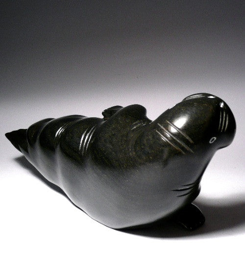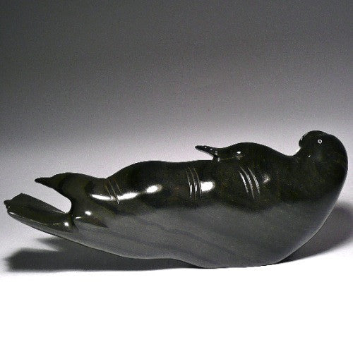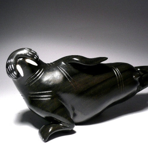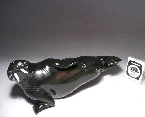 This is an outstanding completely original walrus with tucks by world famous Inuit artist Jimmy Iqaluq from Sanikiluaq. It is a museum quality piece, will worth three/ four times the price when jimmy stops carving. This beautiful carving measures 8.5 inches long by 3.25 inches high, 2.25 inches wide. It's big!