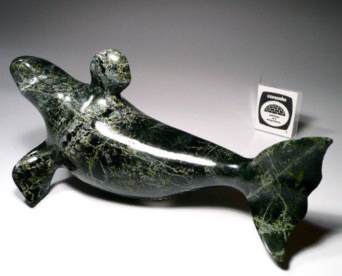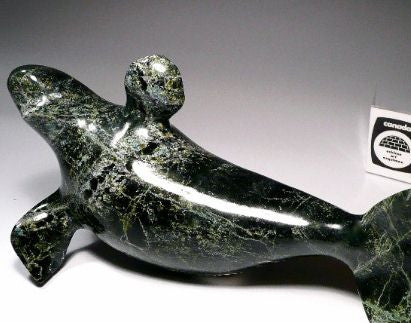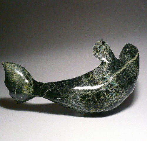 This is a stunning dark colored whale made by Inuit artist Suati Qimirpik from Kimmirut, Nunavut. The attraction to this piece is brought forward by its dramatic dark and glossy finish which add much sophistication to the overall feel and look.